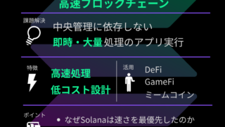 なぜ「速さ」を選んだブロックチェーンなのか 1. Solana(ソラナ)とは何か リアルタイム処理を前提に設計されたブロックチェーン Solana(ソラナ/SOL)は、高い処理性能と低コストを最優先に設計された暗号資産である。 Bitcoi...
