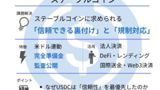 完全準備金と監査を前提に設計されたステーブルコインなぜ「透明性」を選んだステーブルコインなのか 1. USDCとは何か 完全準備金と監査を前提に設計されたステーブルコイン USDC(USD Coin)は、1USDC ≒ 1米ドルの価値を維持...