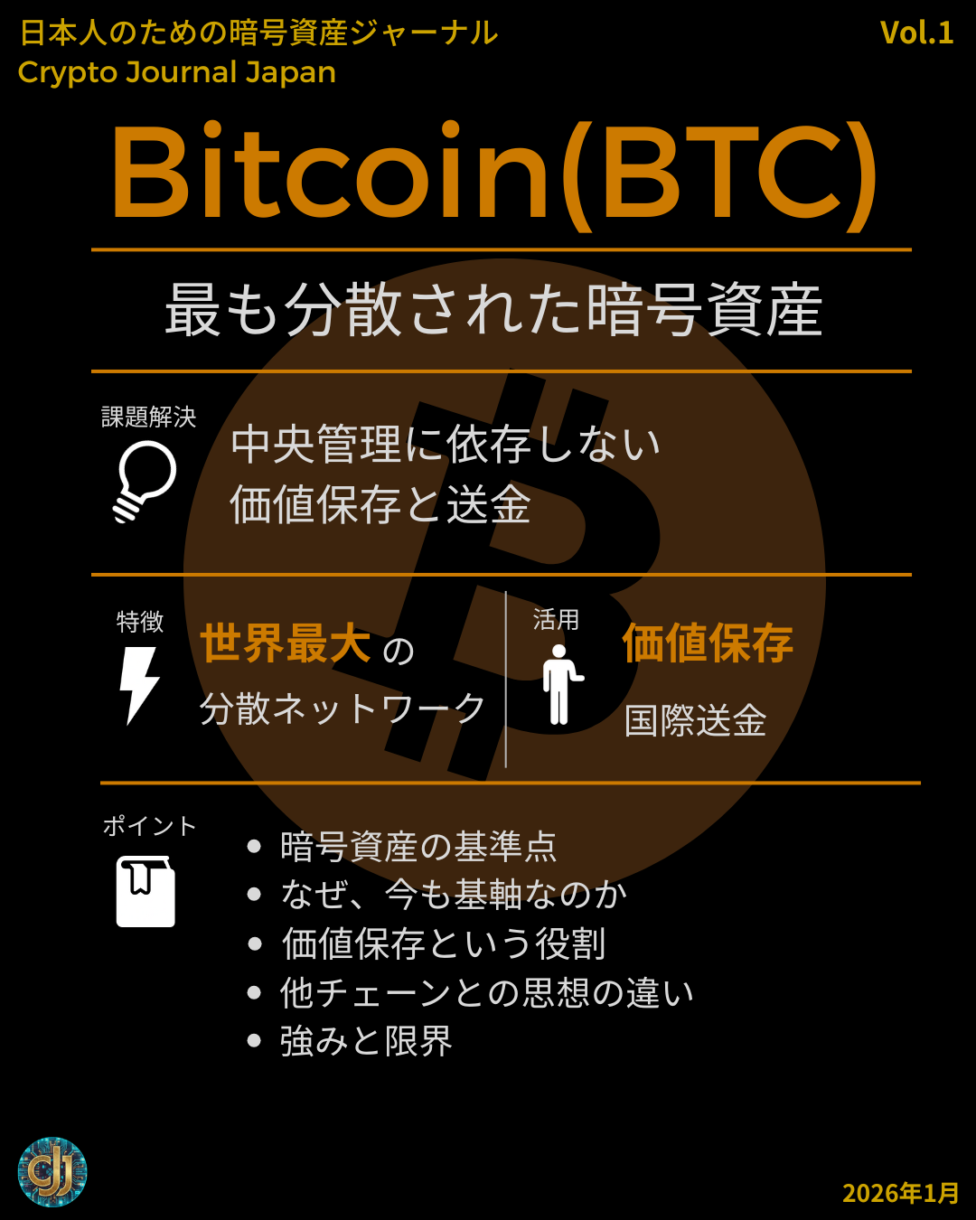 Bitcoin(ビットコイン/BTC)は、中央管理に依存せずに価値を保存・移転できる暗号資産である。