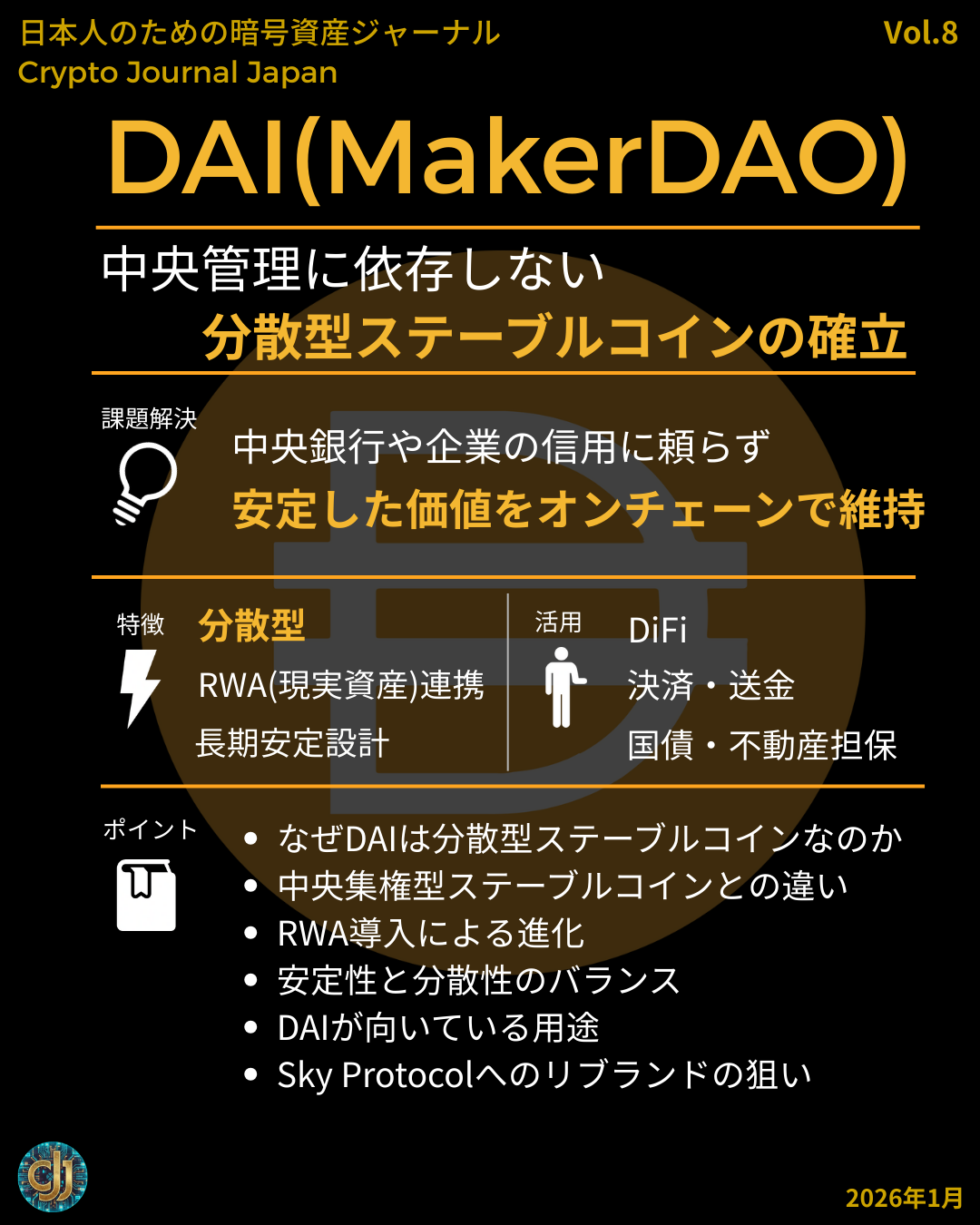 DAIは、企業が発行するUSDTやUSDCとは異なり、分散型プロトコル「MakerDAO(現Sky Protocol)」によって運営されるステーブルコインである。